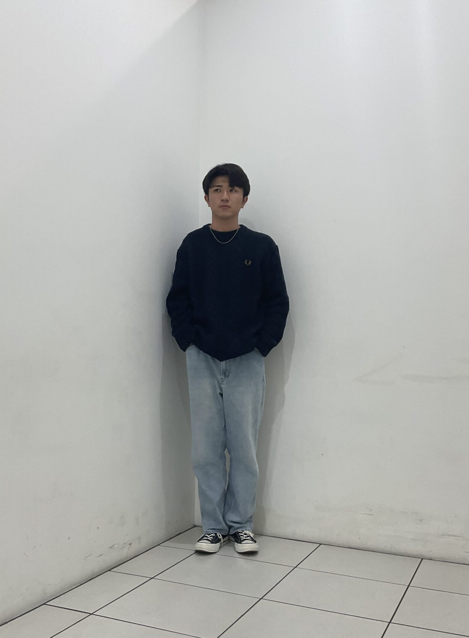 男性スタッフが着用しているニットはラムウール・リサイクルナイロンを使用したクルーネックニットです🧶