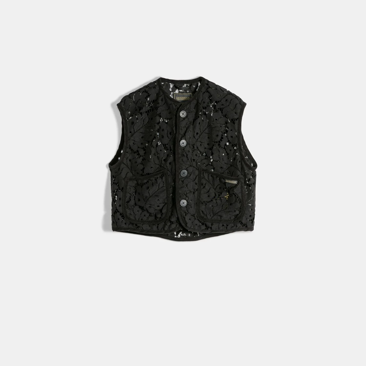 Slightly cropped, no-collar layering gilet (vest) in cotton mix lace fabric.