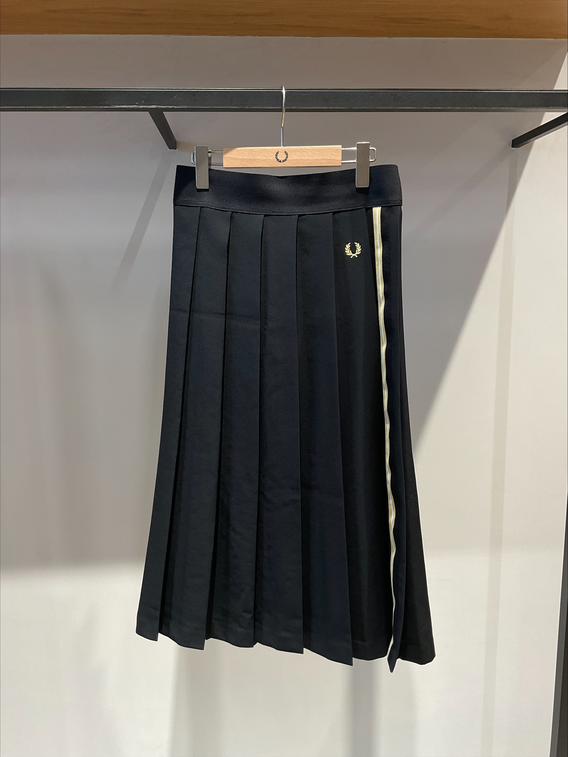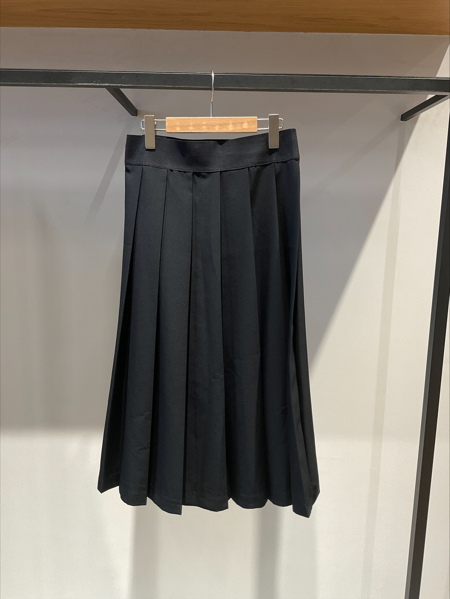 폴리에스테르 트윌 소재를 사용한 플리츠 스커트. 허리 고무줄 사양으로 왼쪽에 부착된 블랙×샴페인 테이프가 포인트입니다.