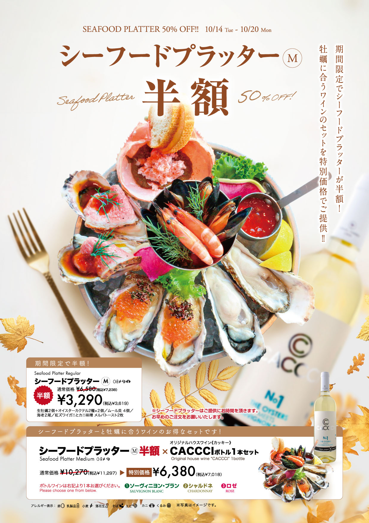 大好評いただいております、牡蠣と魚介をたっぷり盛り込んだオイスターバー特製の「シーフードプラッター」を、10月も期間限定、半額でご提供します!