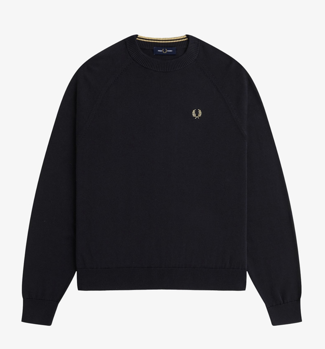 上質なコットンを使用したクルーネックニット。バックネック部分のフレッドペリーのシグニチャーであるティップラインがポイントです。