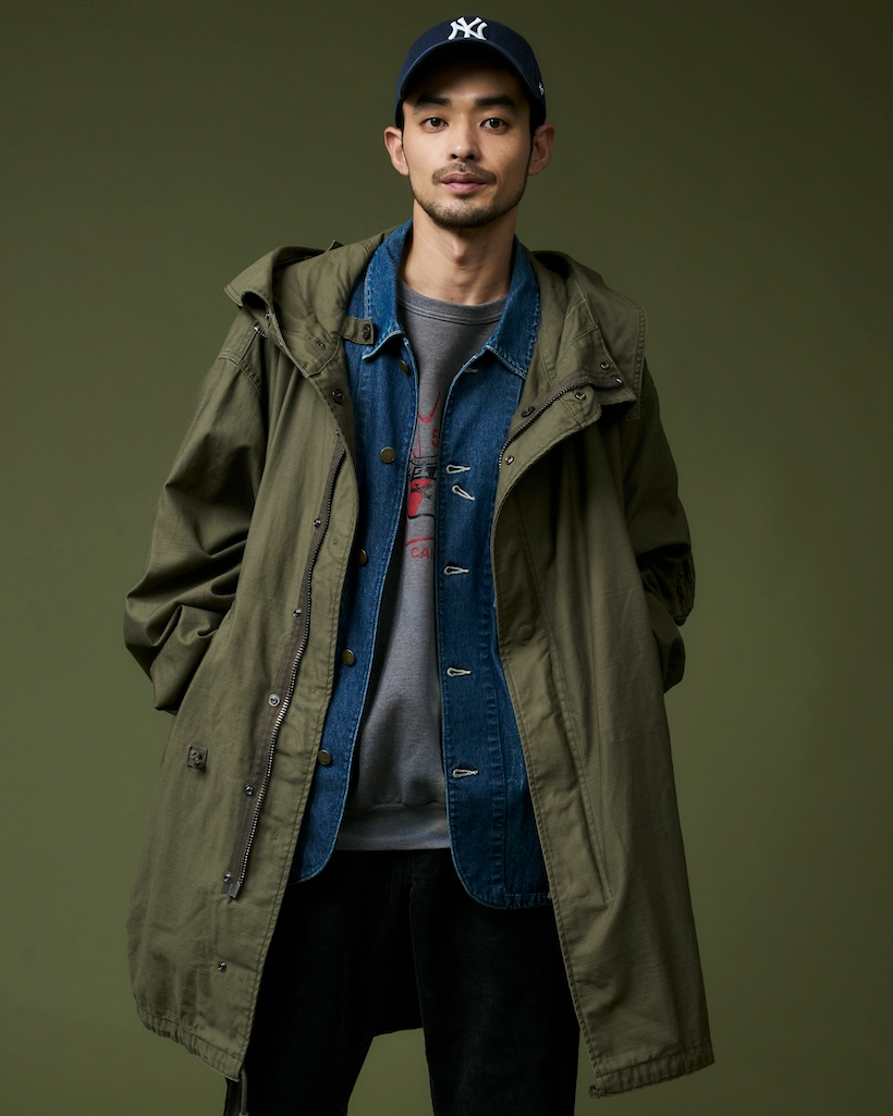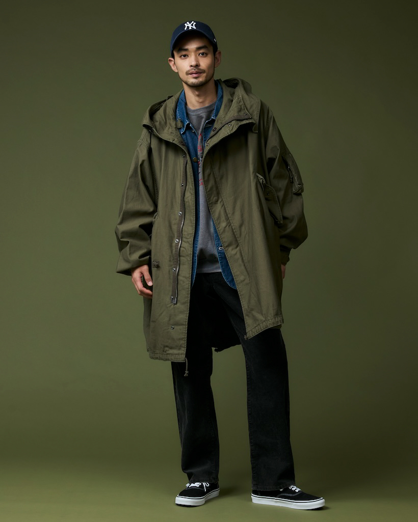 モッズコートの原点とも呼ばれるM-48の本格的な佇まいを活かし、デニムジャケットの上からバサッと羽織るのがおすすめ。少しスポーティーな要素も小物で取り入れて都会的な着こなしに。