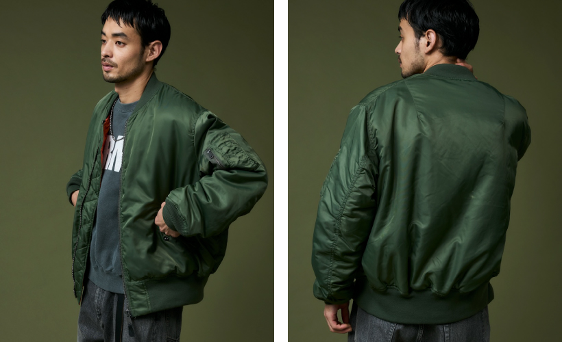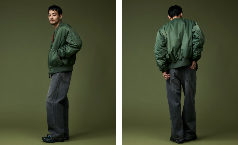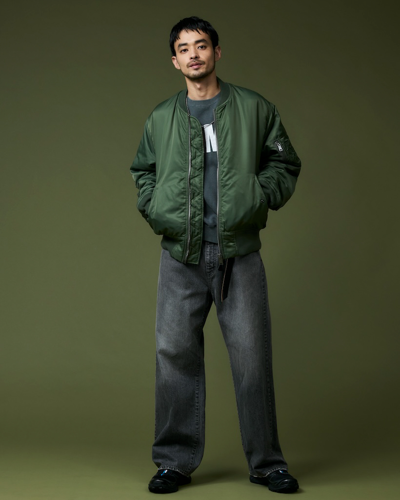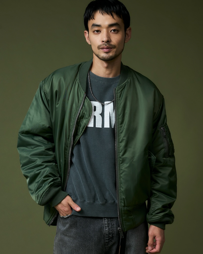 王道アメカジなMA-1は他のアイテムをブラック系で統一してシックでラギッドな印象で着こなしたい。同じくTOP KHAKIからリリースされた新作のスウェットは製品染めとクラックプリント加工を施し合わせるアイテムにぴったり。