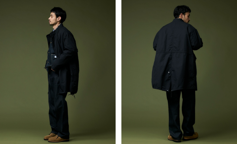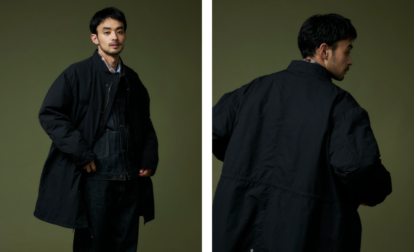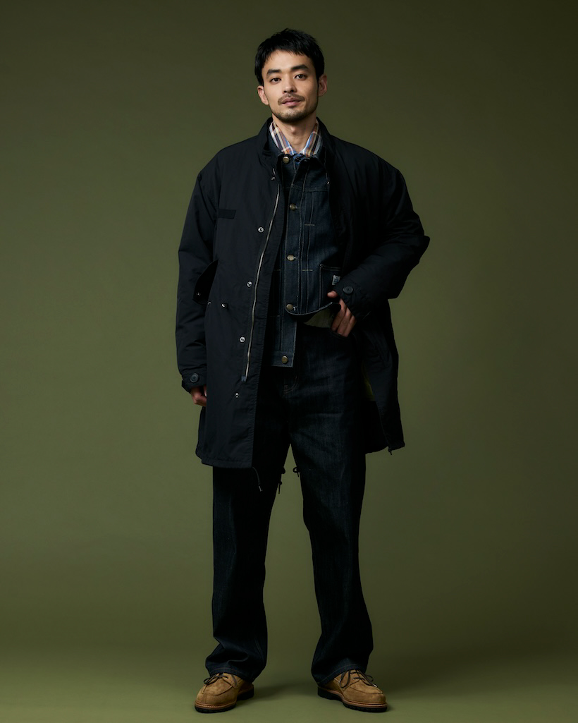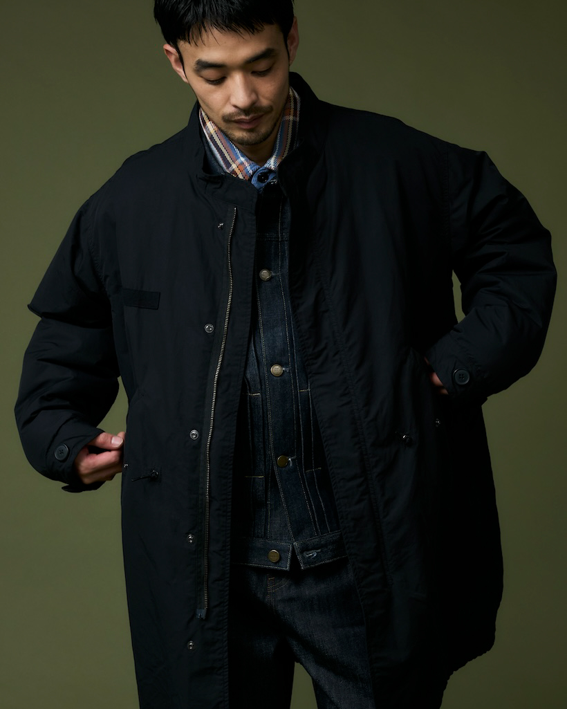 濃紺デニムのセットアップにM-65モッズコートのブラックカラーを合わせた大人な着こなし。着脱可能なライナー付きなので、大本命アウターとして間違いなし。