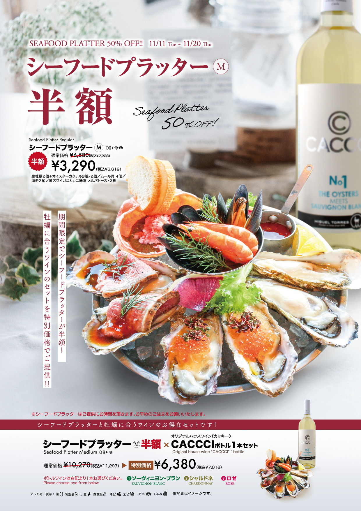 大好評いただいております、牡蠣と魚介をたっぷり盛り込んだオイスターバー特製の「シーフードプラッター」を、11月も期間限定、半額でご提供します!
