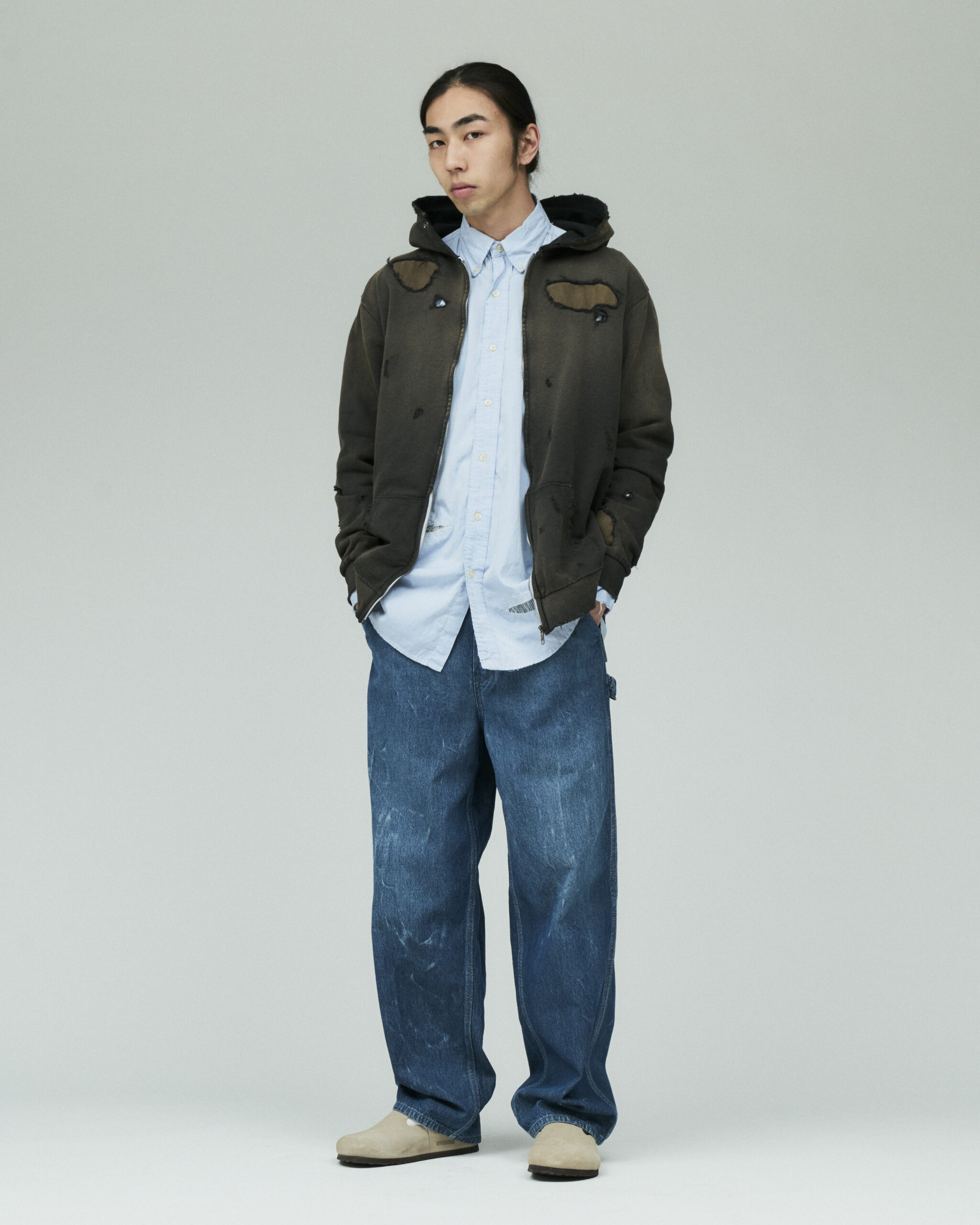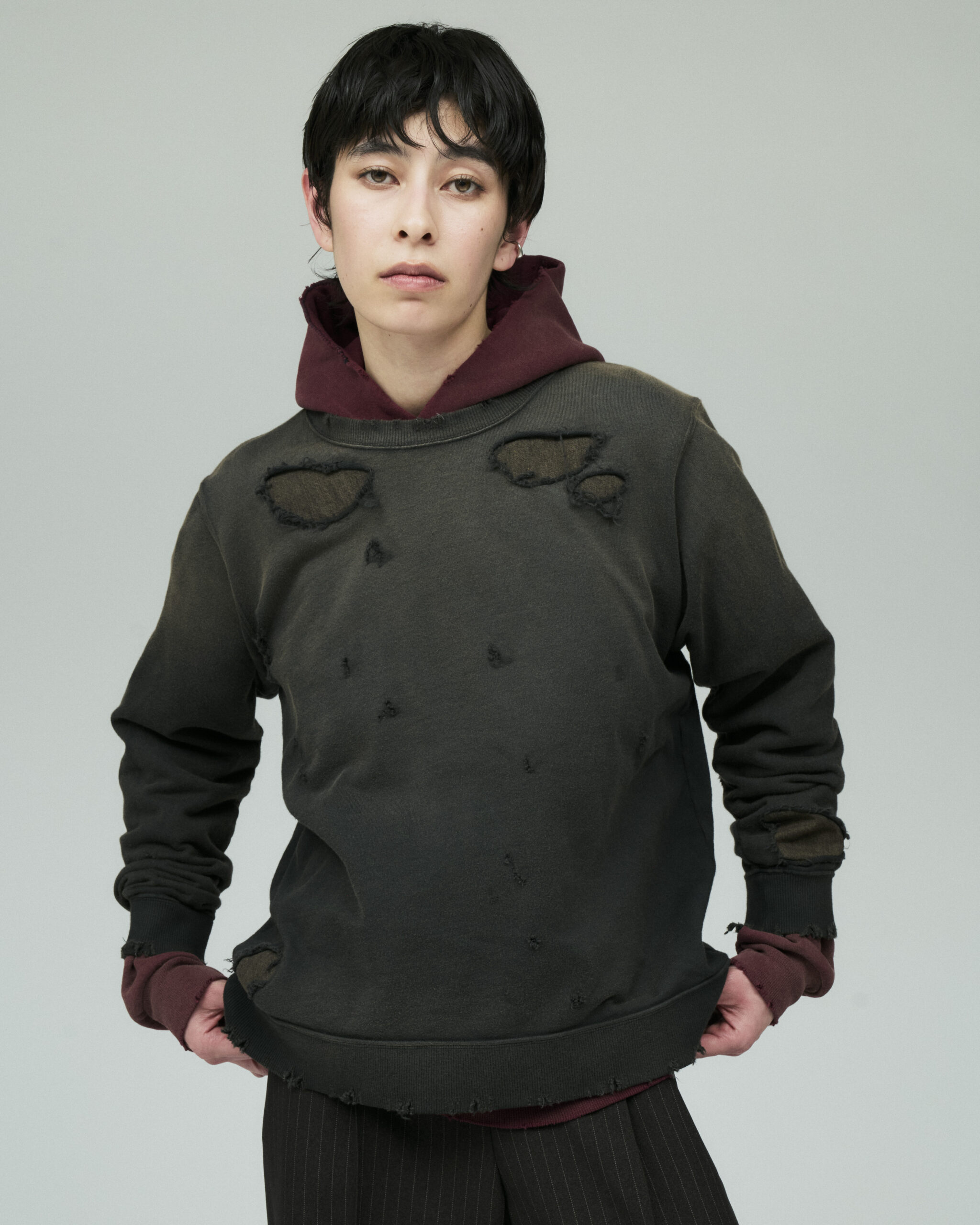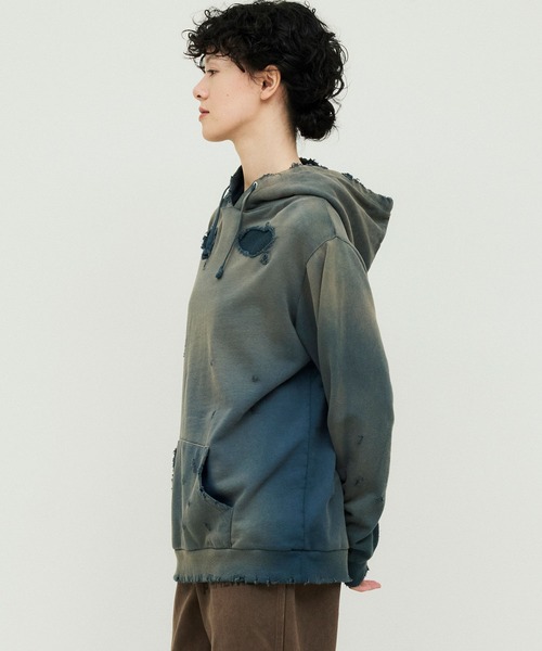 やや薄手の7.4オンスの裏毛を使用しており、ダメージ加工、さらに随所にリメイク加工を施しヴィンテージライクな雰囲気をプラス。