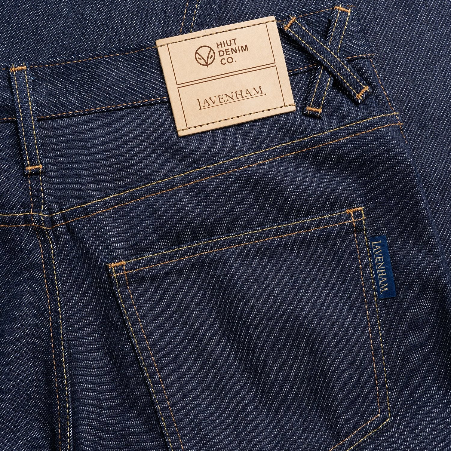 ● 腰のパッチには《 Hiut Denim 》×《 Lavenham 》のダブルネーム特別仕様のレザーブランドパッチを、ピスネームにはLavタブを施しています。