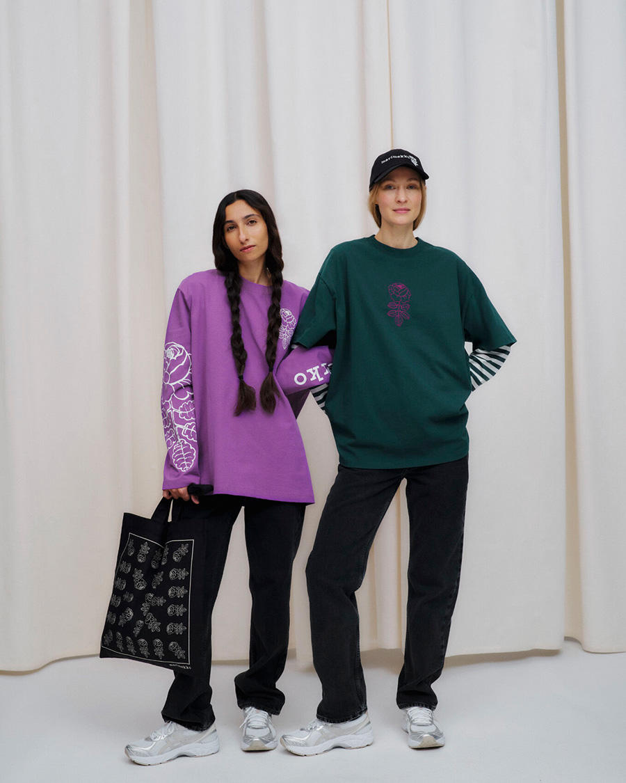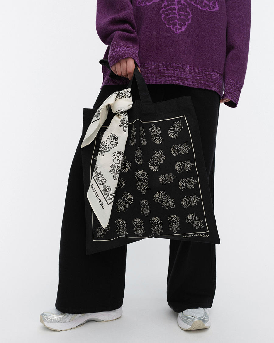 Vihkiruusuを全面にあしらったスウェットやパンツのセットアップ、ワンポイントのシャツやプルオーバーが揃い、キャンバスバッグシリーズVankkaや、スカーフ、キャップなどがラインナップ。