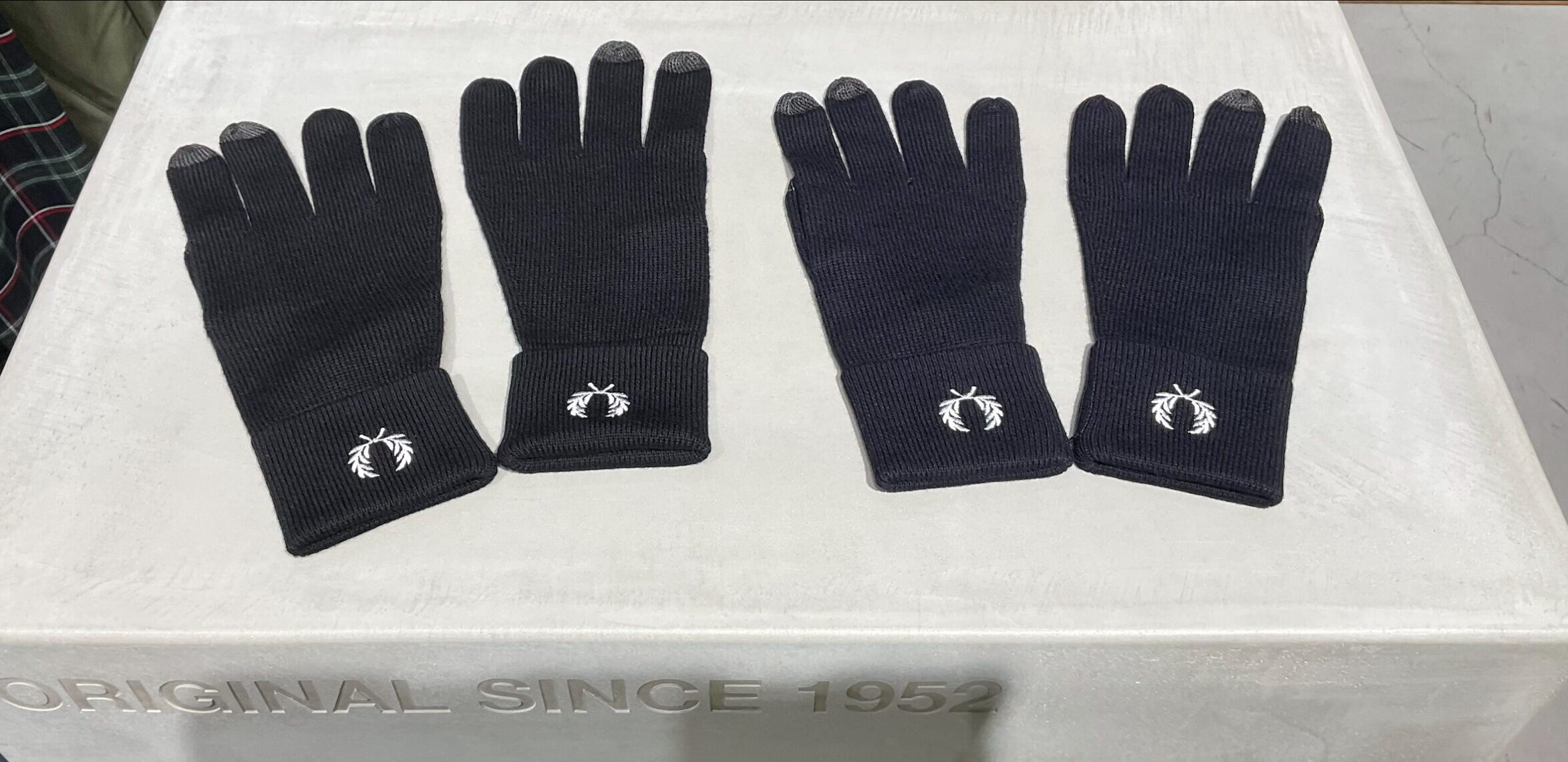 这款手套采用美利奴羊毛混纺面料制成,袖口饰有罗纹和 Fred Perry 标志性细节。