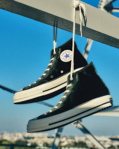 クラシックなアーカイヴデザインをベースにした「ALL STAR LGCY」のアッパーに深みのあるグリーンのベルベットを採用。光の加減や角度によって表情を変える独特の素材感が、足元にラグジュアリーな奥行きを与える。