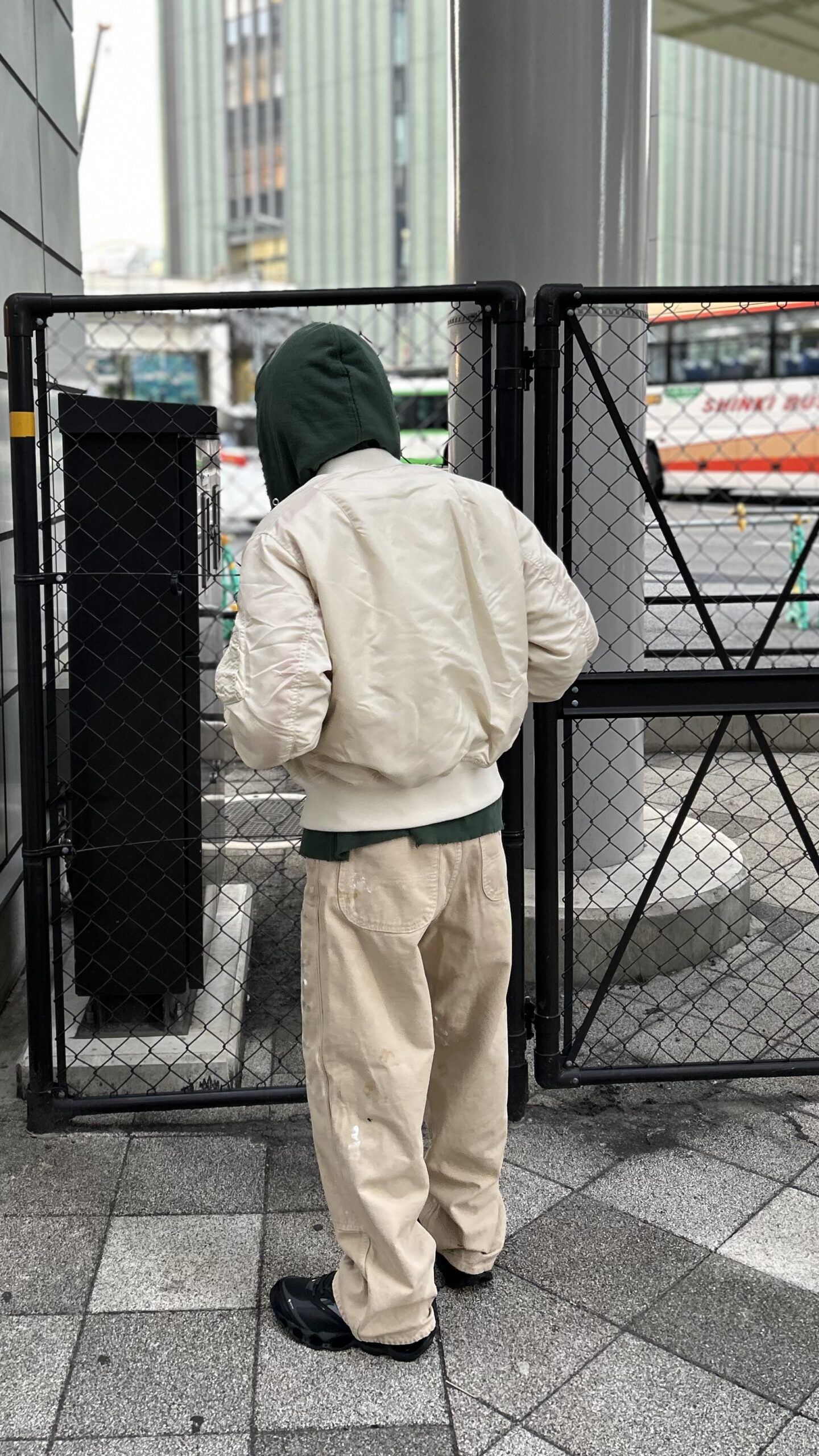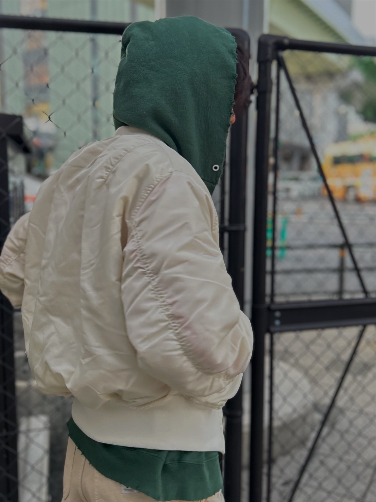 MA-1 blouson 選用於外衣。象牙色的尼龍具有良好的光澤,與工裝褲搭配出凹凸有致的平衡感。